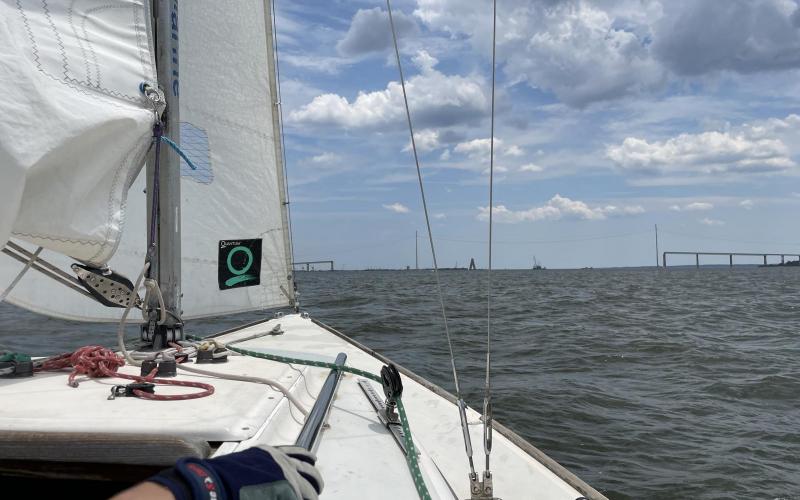 Took #6 out to practice for otw teaching w/Robert. 50's F super sunny and beautiful, wind started very low but picked up to an excellent 10-12 I'd guess. Wind from the ESE with pretty annoying fluctuations that made my figure 8 POB practice hard. Still made good progress and am getting reasonably comfortable with it. After a bit we sailed out past the fort and back. 4 hrs sailing.