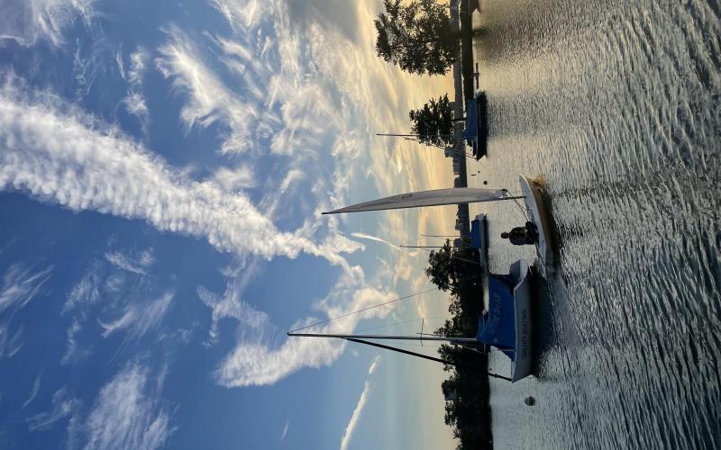 Came down to ZERO wind, so coerced Madi into rigging some lasers with me. Perfect day to remember how it all works, since there's no wind to knock down a mast and nobody rearing to get out there behind us, so we can take as long as we want. By the time we both had managed to rig our boats, it was nearing time, so I launced for a quick (slow) spin around the mooring field (where I quickly realized I had rigged some of my boat wrong) in the approaching sunset.