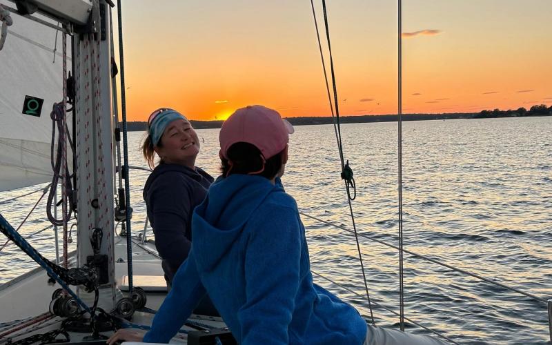 Out for our weekly sunset sail today on Barba Roja. Great conditions and pleasant weather for a relaxing sail with good company. We put up "Dory" the staysail and experimented with rolling the furling headsail to tack. Afterwards, we leisurely ambled across the river basin and sailed almost all the way back to the slip.