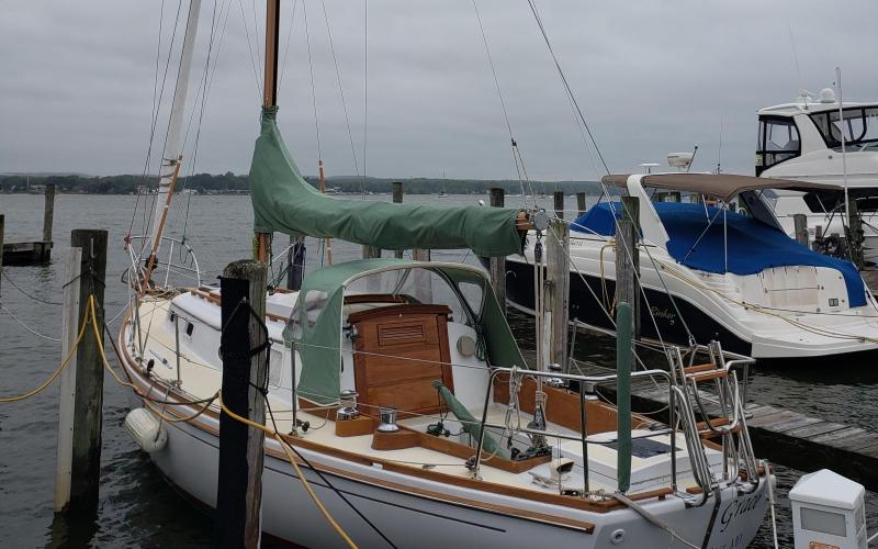 9/5 Worton Creek to Still Pond via a lap around Poole's Island. S5-10, 88/70, sunny. We enjoyed a liesurely breakfast at anchor. I actually got up at 5am to make coffee and watch the sunrise. As day came on, the hooting of barred owls was joined by a caucaphony of crowing roosters. I watched a great blue heron defend its favorite fishing log against an encroaching cormorant. At 10am we headed out onto the Bay to begin a lap around Poole's Island. The current was with us at the start, but then turned opposing as we neared the midpoint of the island. We hugged the shallows to stay out of it, short-tacking south. This strategy proved especially helpful as the breeze eased up. We cleared the southern tip of Poole's Island and rode the tide, broad-reaching north to Still Pond. Labor Day festivities were in full swing, but our sweet spot away from the crowds was waiting for us.