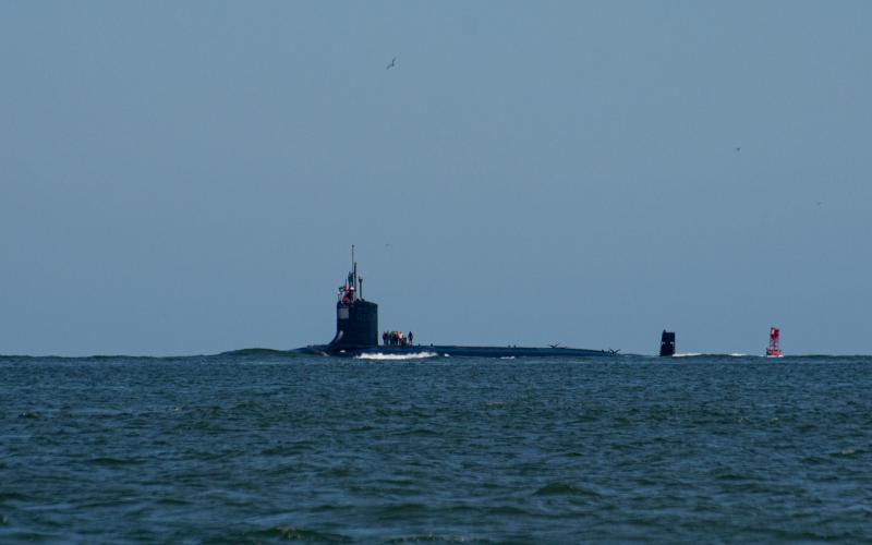 A south wind in the low teens carried us out to the main channel and east. Returning against a decreasing outgoing tide the winds shifted to the SW which had us tacking up the narrow entrance to Willoughby Bay. My neighbor Eris joined me and was rewarded with a submarine passing us apparently headed to Newport News.