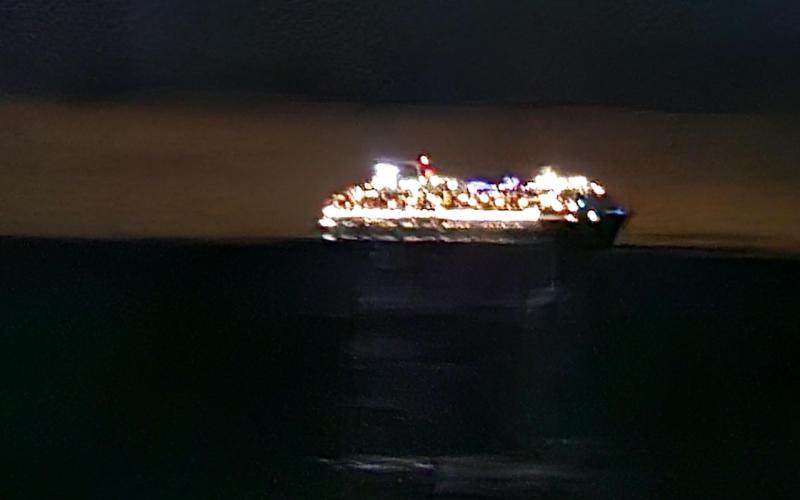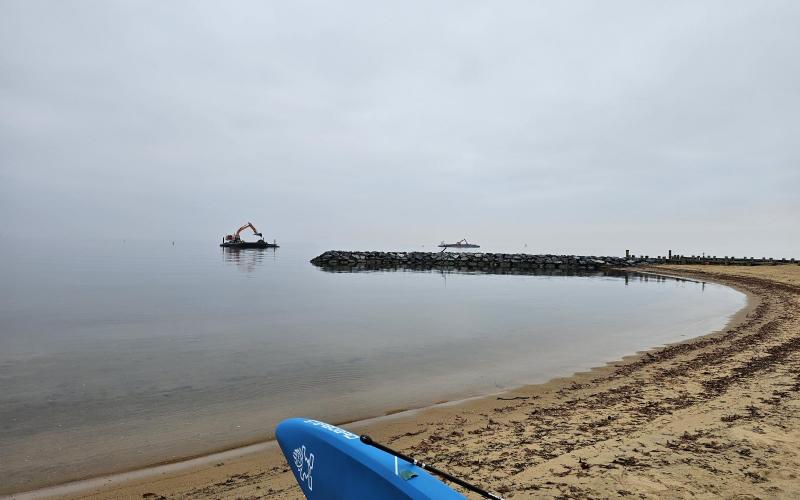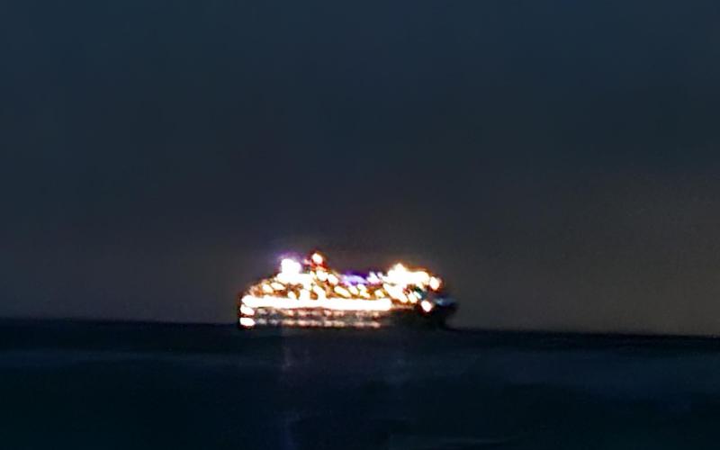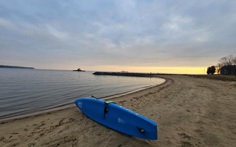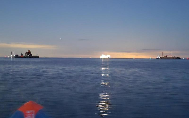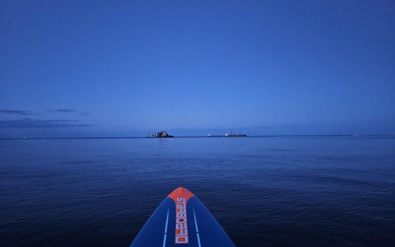 Sunset SUP. Little Magothy Inlet marks to tour of LM and then sunset beer drifting off the beach. Visited with neighbors at the LM pier, and at house piers. Dredge barges anchored in the channel, and the cruise ship coming out of Baltimore.