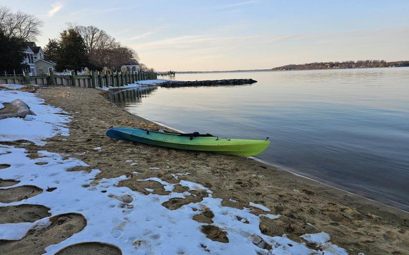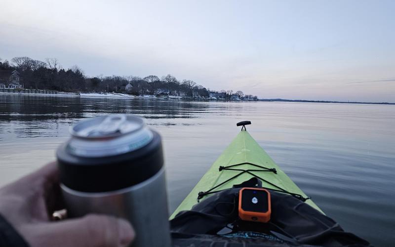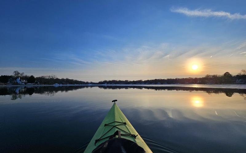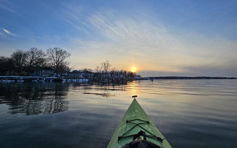 Sunset paddle. Into to the Little Magothy to see the ice. Then up past Persimmon Point, back to beach for a sunset beer.