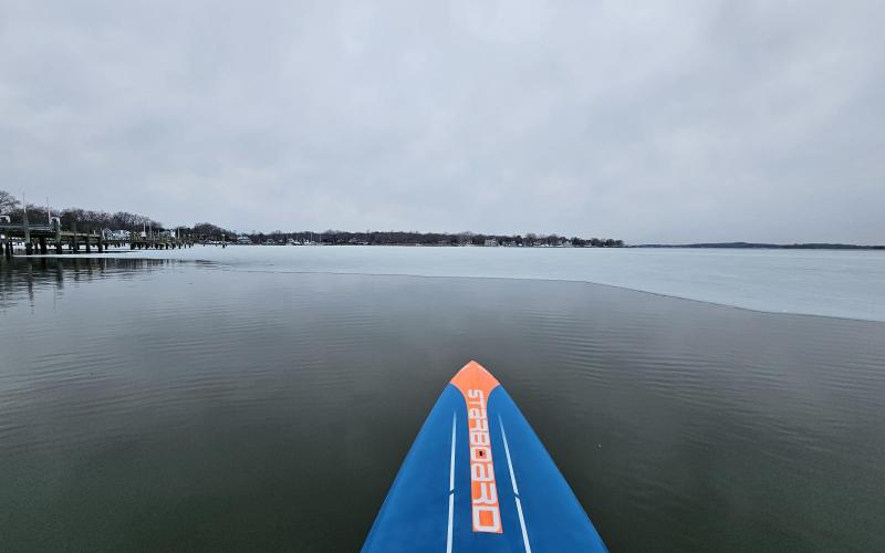 Afternoon SUP. The wind finally died down, snow on the ground and a bit cold! Ice in the Little Magothy didn't get my full tour in, came out to the first inlet mark then up towards Persimmon Pt and back along the shore. Nice and chilly!
