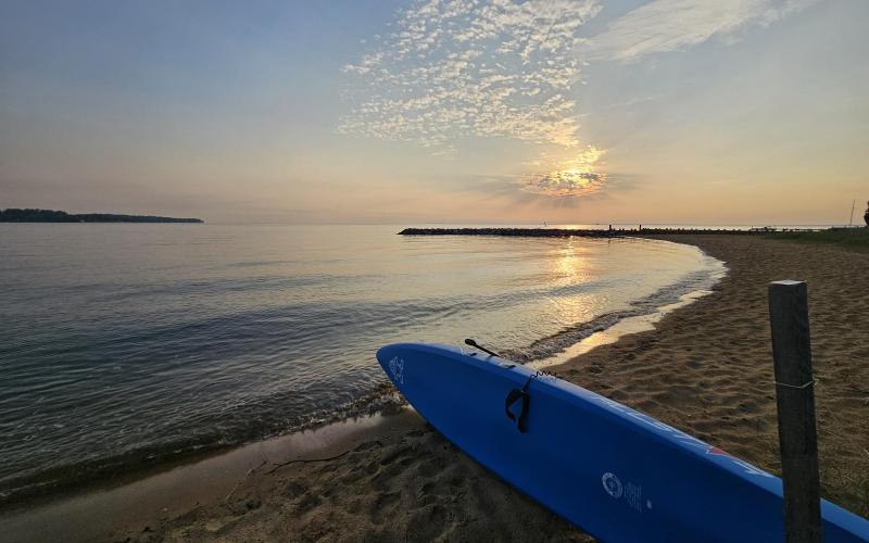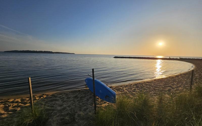 Helped the new neighbors with rigging Sunfish and giving them a sailing lesson. Rigged both of my fish but didn't end up going out on them. Did try getting the dogs used to being on the SUPs. Family at the beach with dogs, daughter and me taking the dogs for rides on the Bote Flood, then a paddle up the beach shore and back