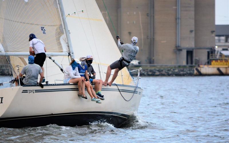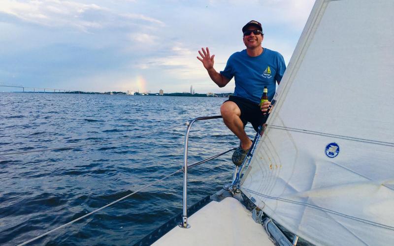 We took out some neighbors who've never been on a sailboat before! A little while into the trip, we had them working the entire boat with all sails up. A rainbow at sunset, great views of the industrial workings of the city, Fort McHenry and the recently-placed Frances Scott Key buoy made for a great night on the water.