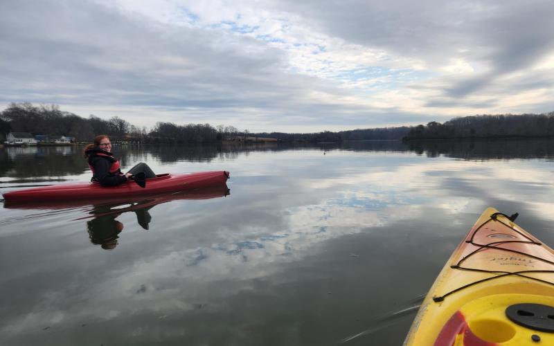 Kayaking around the dock breaking ice. I felt like a duck in a puddle. Sunset and flocks of swans were beautiful.