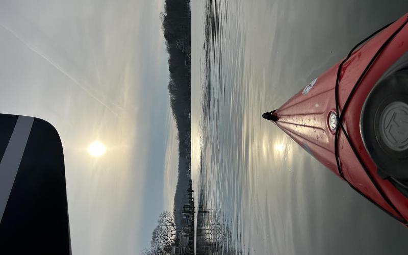 Snow still covered our beach, but it looked like I'd be able to kayak around the edges of the ice floe stretching across Valentine Creek. Turned out not to be the case. Beyond the docks with bubblers I could not get through and had to come home.