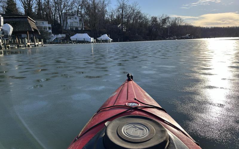 55 degrees and most, but not all, of the ice is finally gone. Could get past the Herald Harbor boat ramp today, which I couldn't yesterday, so that's progress. Ran into a sailing buddy also out on his kayak so we had a companionable time kayaking across the Severn and back. Felt like a cool fall day.