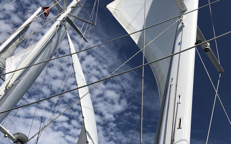 Arabella, a 157-foot 3-masted schooner, cruises two main locations a year, New England and the British Virgin Islands. We joined the ship in Newport, RI, and sailed to Martha's Vineyard, on to Nantucket, back to Martha's Vineyard, on to Cuttyhunk , and back to Newport. Arabella's mainsail is a spanker off its mizzen mast, and going forward, she sports a mizzen staysail, a main fisherman, a main staysail, a fore fisherman, a fore staysail, and a jib. The crew of 7 (skipper, master, deckhand, engineer, plus chef, and two stewards), quickly put up all the sails on Monday morning on our way to Edgartown, in breeze of about 13-15 knots -- it helps that 5 of the 7 are on hydraulic winches. We were fairly quickly moving along at 8 knots, though the engine remained on, since we were 'on a schedule.' The skipper was happy for any of the 30 passengers who wanted to to steer, which I did a good bit. Arabella has a sea-kindly motion, and easily translated 20-knot gusts of wind into forward motion, hitting 11-12 knots during those gusts. Since this 98-ton vessel draws 13 feet, we anchored well outside the harbor at each stop, putting out "two shots" of chain with the anchor, a shot being 80 feet. On Wednesday night, we put out 3 shots, since tropical storm Ida was coming, and good we did, since we were awakened at 5 a.m. with someone alerting the captain 'the anchor is dragging.' A 180 degree windshift had pulled the anchor free -- that along with 36 knots sustained, with gusts to 61. Once they got the engine on, the anchor re-set, and the crew kept the engine on to ensure we stayed off the lee shore -- which had been about half a mile off the night before, and ended up being about 100 yards off. Wind dissipated as Thursday wore on, eventually lowering the wave heights so people could go into Edgartown on the 20' dinghy. A fabulous lobster bake on Cuttyhunk the next day was a fitting follow-up to Ida -- a gorgeous day of sailing, with fresh lobster to enjoy afterwards. Heck of a week!