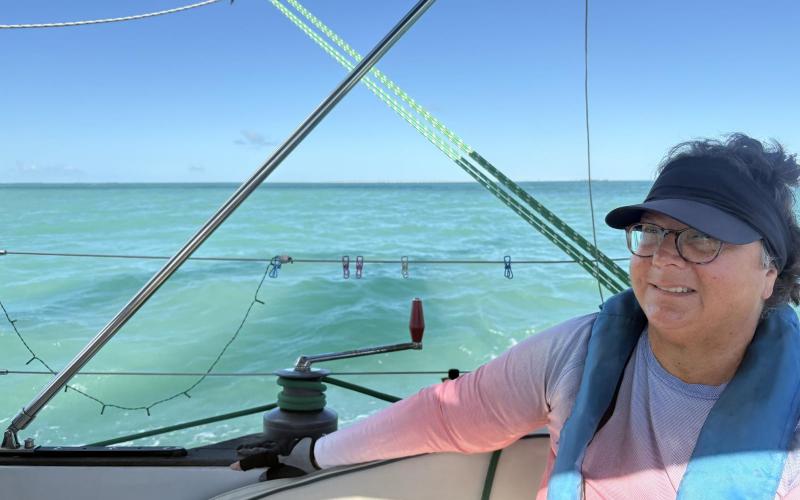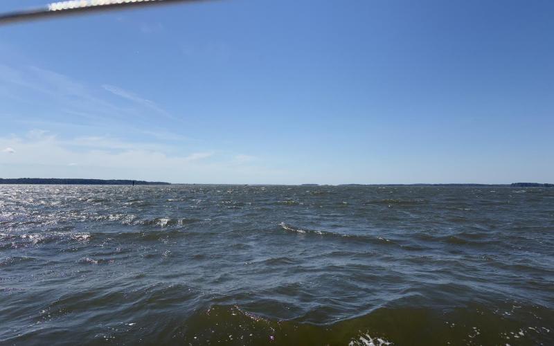September 4 - Again, full crew sail but the winds were a bit stronger and a SCA was out. Found winds out of the South 12 - 22 knots. We had both sails reefed - I put a double reef in the main and rolled up the headsail quite a bit. First mate started at the helm and we continued working for the balance and comfort as we are going to need this on our trip south. Fought the winds and waves - which were very choppy for about 3 hours before heading off and anchoring at Cacaway to relax before heading back in.