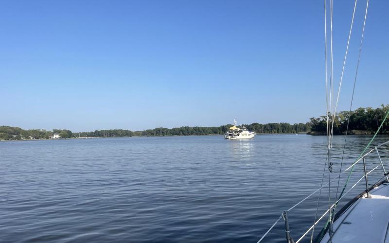 Wednesday the 25th - Left Lankford Bay marina a bit later than I wanted - got out of the slip, after provisioning, at 11:30. Temp was 62-75, Barometer was 30.30 and falling. Winds were out of the west at 5-10. Motor sailed down the Chester and saw a bunch of ships heading up to Chestertown for the Sultana Downrigging. Took pictures and shared them. Got the sails up around Kent island for almost the rest of the trip up to fairlee creek. Turned on the engine again about 5 - as the wind had petered out (of course, as soon as the engine came on and sails were down... the wind came back up!) because I wanted to make the anchorage before sunset. Got in - only two other boats in the anchorage. Had a lovely evening and a fun sail.