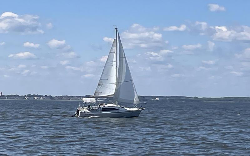 Temperatures were between 63-71 during our sail. Barometer was at 30.15 with the wind at 10 knots + with some gusts. There was a small craft advisory out. it was mostly cloudy with some sun sneaking through at times. First mate took the helm from the beginning , got the sails up quickly and I took care of managing the sails. We headed down Langford Creek and into the Chester and to make it more comfortable for the first mate, we decided to head up the Chester - allowing the land to block some of the wind. Headed up towards Cliff's Point - first mate did a nice job getting her through that narrow area and then we continued on. Decided to drop the anchor at Conquest Beach (no one else was around) for lunch and then we set sail to return. Left the marina about 10 am and didn't get back until 5! Lovely day and the first mate continued to work on her skills at the helm!
