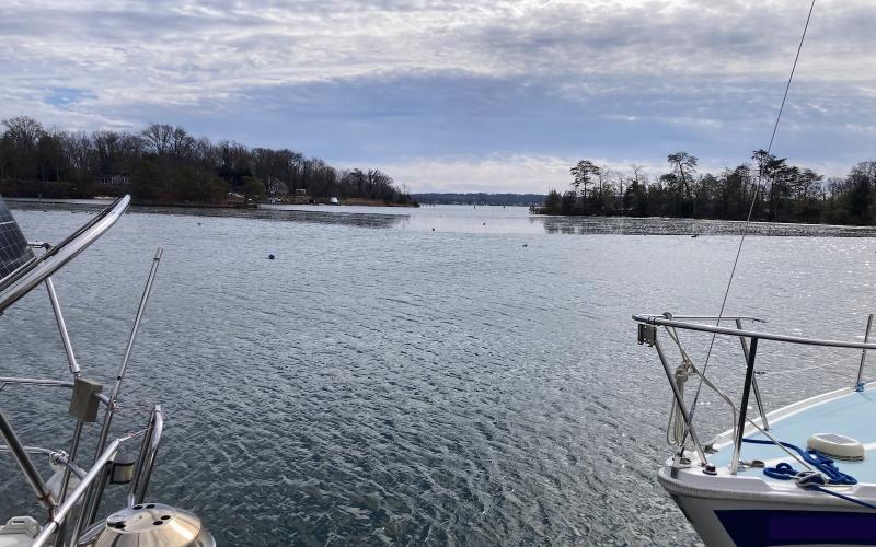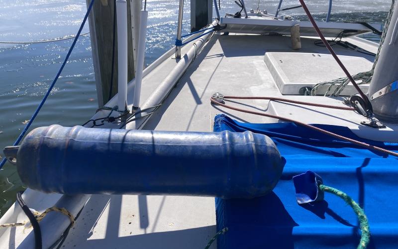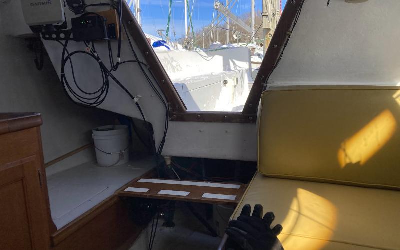 Got on board. It was actually pretty dicey. Like the crowned deck on a J24, every surface was pointing to the water. But there was a tiny bit of footing in the cockpit. The boom and backstays made for adequate handholds however.
