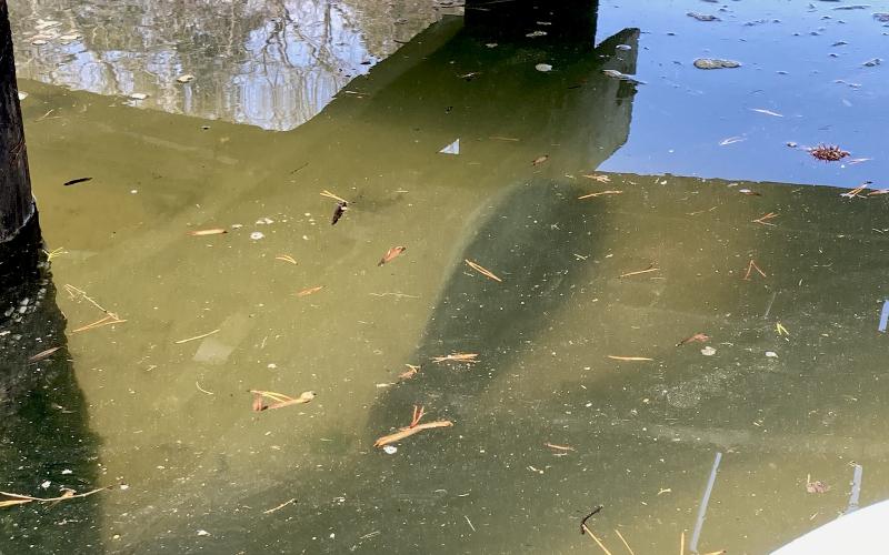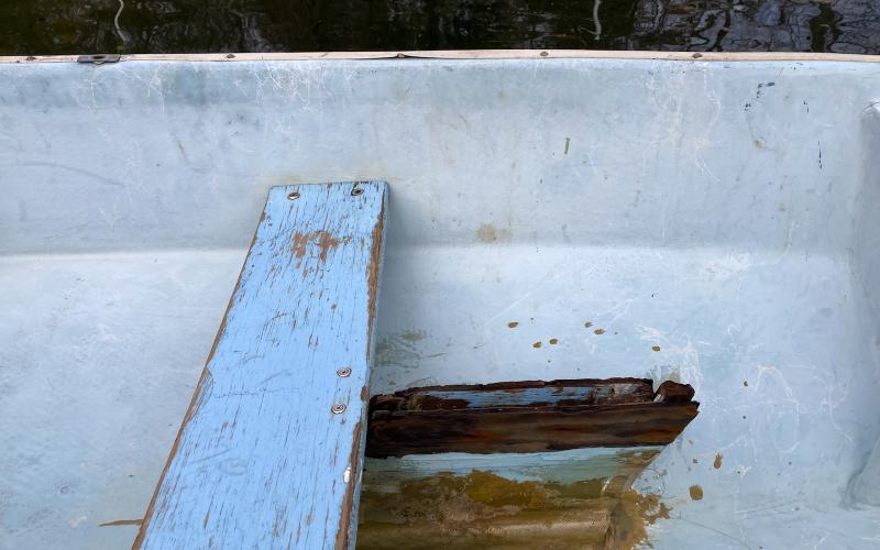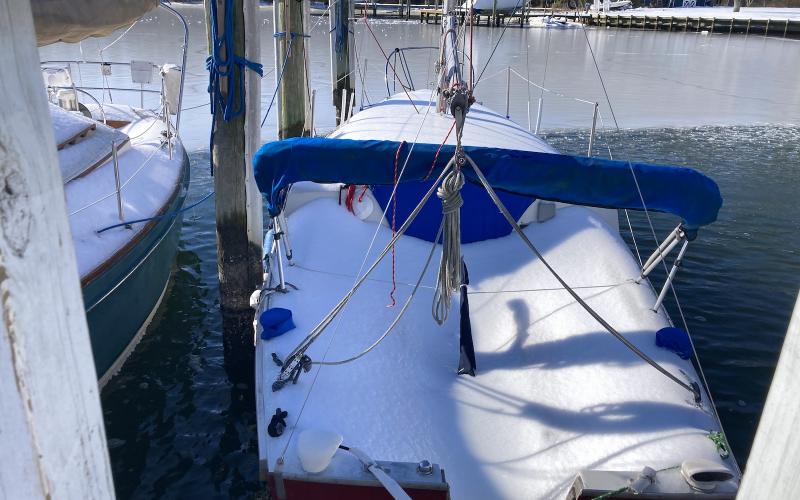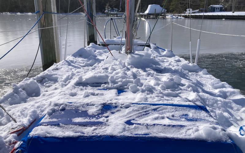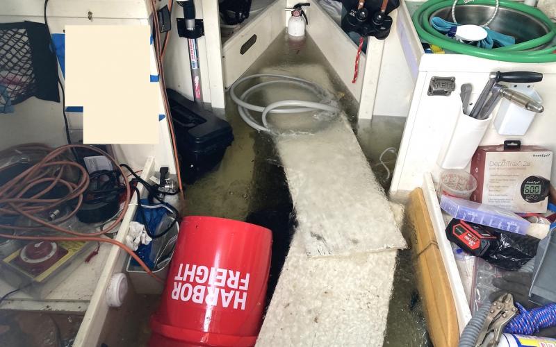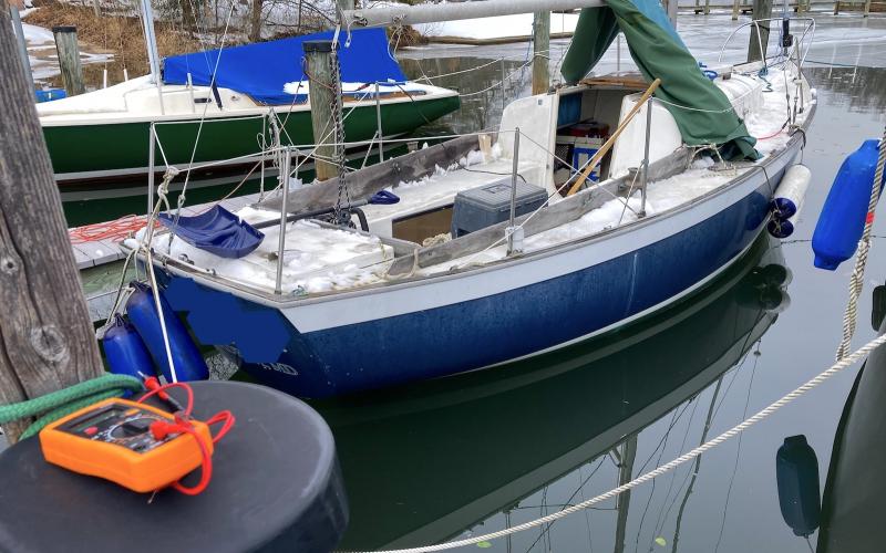 Long and short, it took over an hour to gain access to below decks. Battery was fine, 12.17 volts. Solar panel, once cleared, was feeding a trickle to the battery. Bilge pump was working. Another hour and change I had most of the heavy stuff off the decks. Waterline was improved markedly.