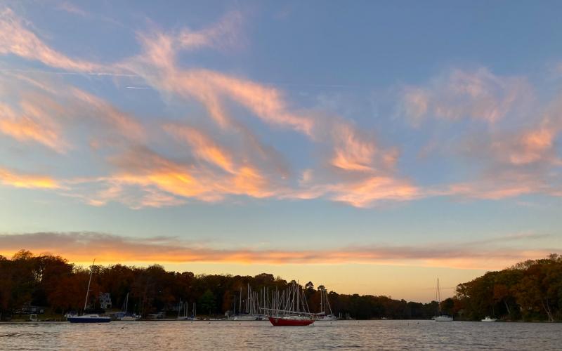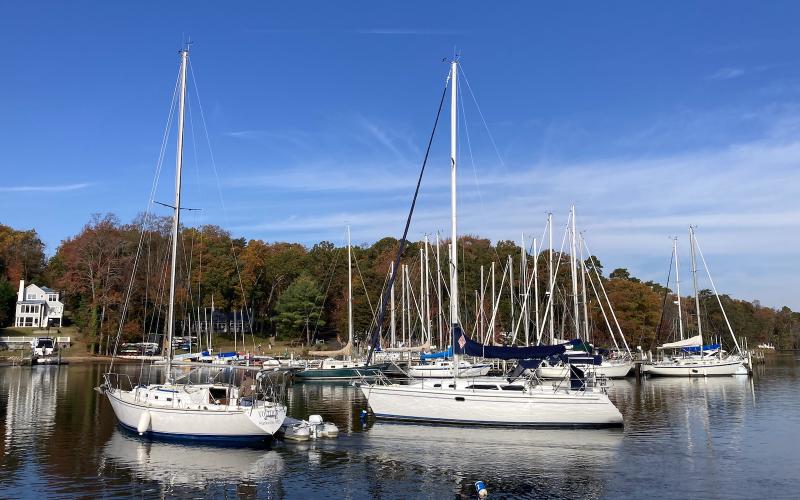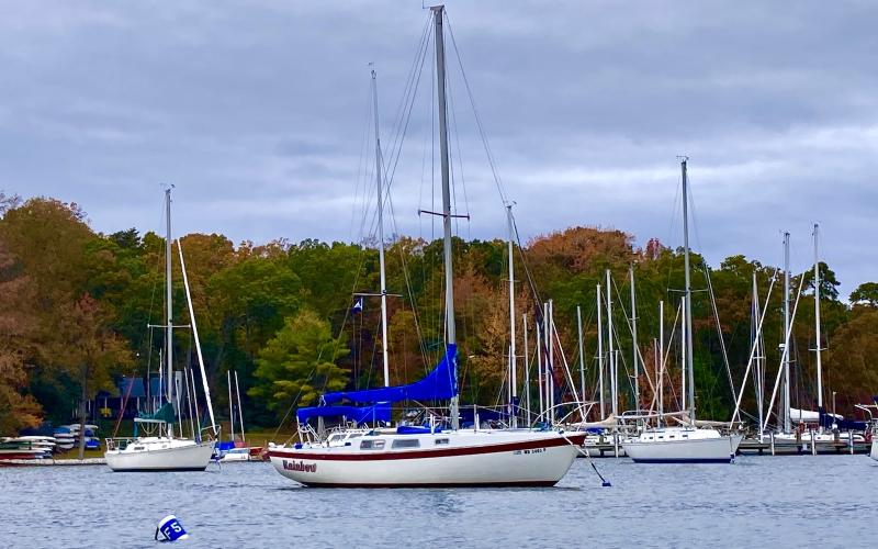 Then it got windy. Peak gust a few miles away on Gibson Island was 46 (mph) and it was due to get windier. So I went below and ate breakfast, or "brunch" by this time, and listened to the puffs roar down the creek. Then I went to the floating dock abeam of RAINBOW to see how it was riding in the big breeze. I wasn't satisfied so I tweaked the lines a little more.
