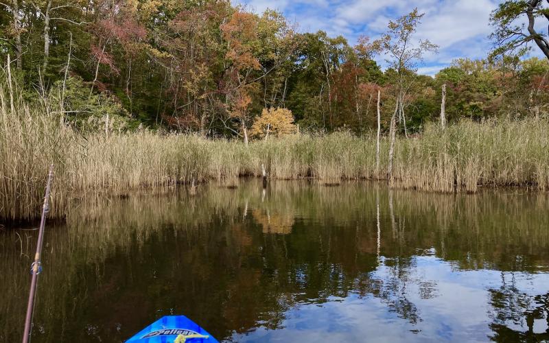Ostensible purpose was to let the boat inside me, of the pier raft-up, out so that they could cruise to St. Mike's. But it gave me a whole day to mess around with kayaking, fishing and tourism. The tour took me all the way to the back of the creek's western cove, and I finally ran into enough shallow water and snags to turn around. It was a rising tide, so I wasn't that worried about getting stranded back there and then having to slog 400 yars in knee or thigh-deep mud. But the surface indications showed an ebb and it was definitely getting shallower. So I breathed a sigh of relief when I reached deeper water.
