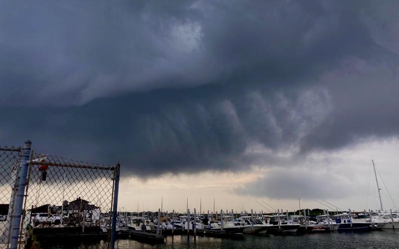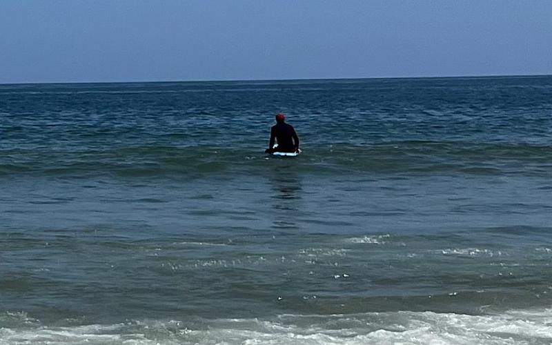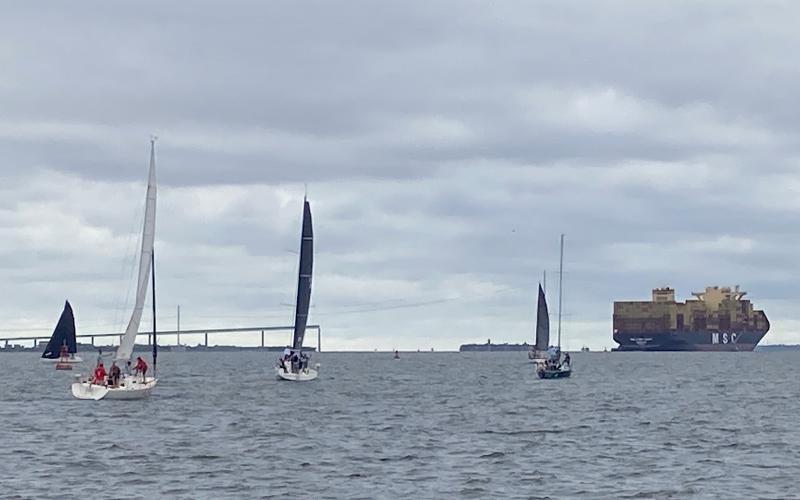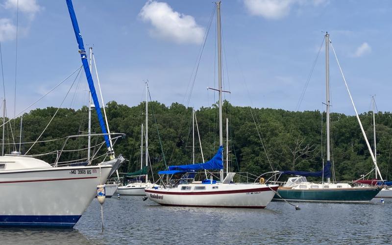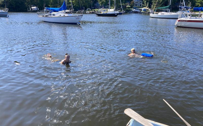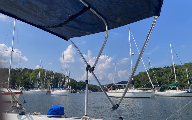I was about 1.5 seconds from getting on the boat when a sudden weight shift (still not sure where) sunk the dinghy's bow and almost instantly swamped the whole g.d. thing and capsized it, sending the O/B down to the bottom and leaving about six inches of the nose of the dinghy above water. I remember standing on the transom of RAINBOW thinking, "OK, that could have gone a lot better."