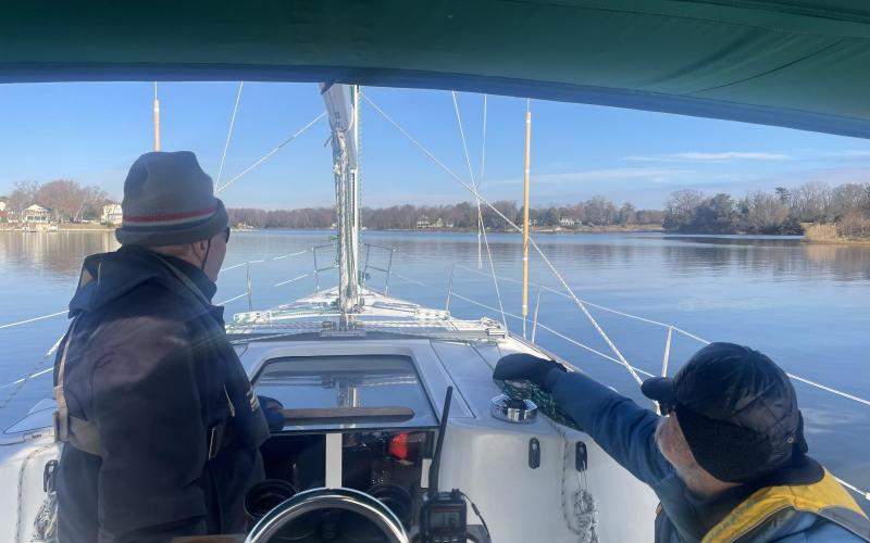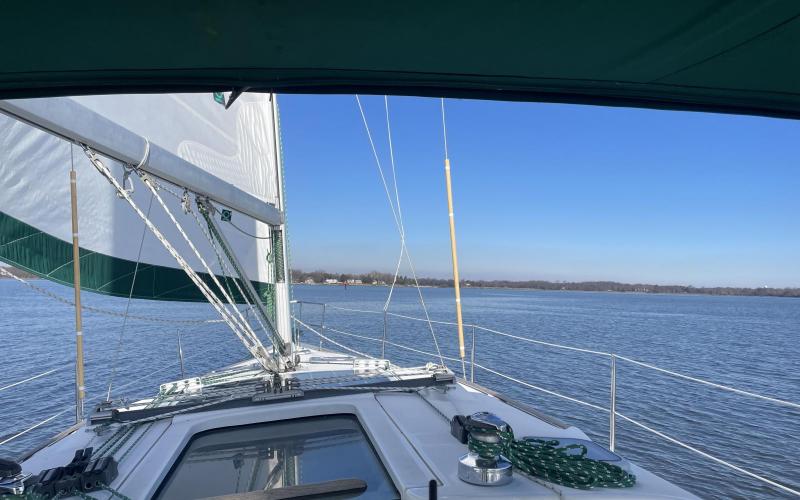 I took Mystic out for a solo sail to Annapolis harbor. Sunny with temp in the low 50s. Winds 12-18 knots from the south.