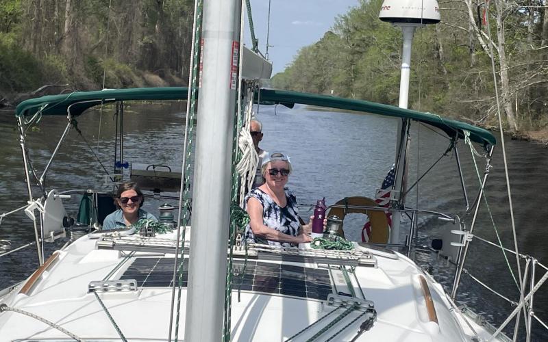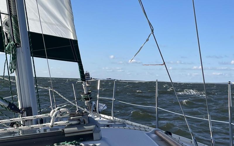 At last, the nasty weather is over. After a bacon and eggs breakfast aboard Mystic, we departed Beaufort just before 9 am for a 57 nm journey to our next destination. Sunny with a morning temperature of 45 degrees and a high of 60 degrees. Winds were typically 15 knots from the northeast. That's back to shorts weather for me.