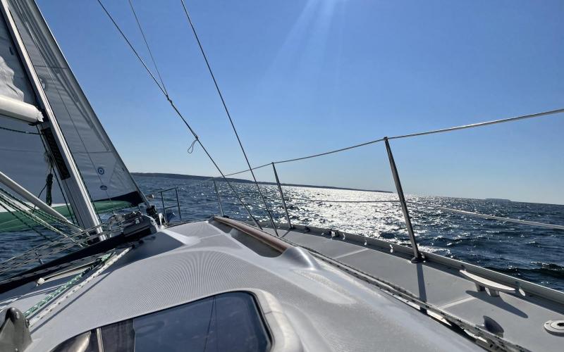 A solo sail with winds peaking at 33 knots from the west. Double reef in main and jib.