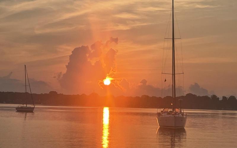 Eight boats departed Rideout Creek for the west fork of Langford Creek off the Chester River. They were Whisper, Karaya, Gambrinus, Capricorn, Moonshadow, Mystral, Shaken Not Stirred, and Mystic. We had a perfect 15 knot breeze from the south. With the threat of thunderstorms we all anchored individually. The forecast did not disappoint. The rain and wind hit about 7:00 pm with three boats dragging anchor. Mystic slid by Karaya with no harm done. We were all treated to a glorious sunset.
