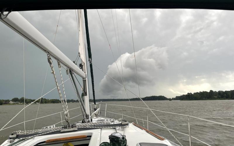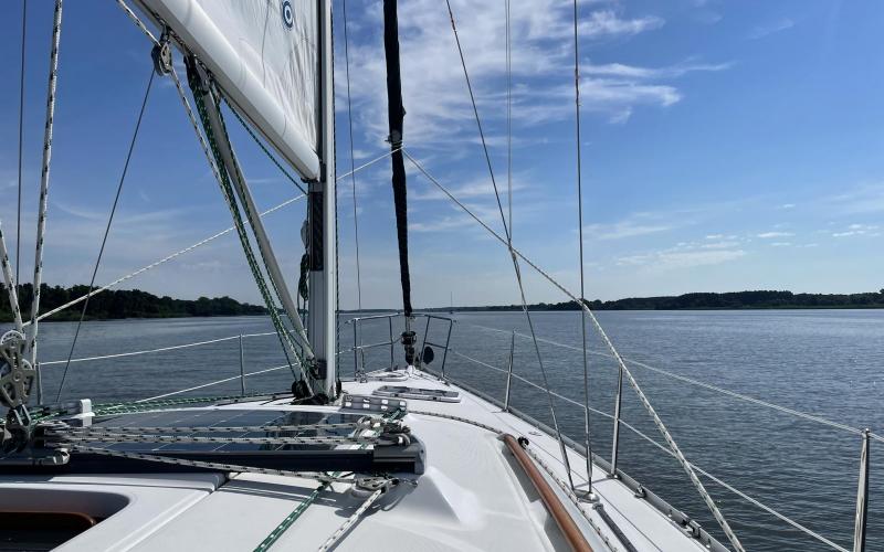 A solo sail to Annapolis harbor and back. 10 knots from the south. Sunny and warm.