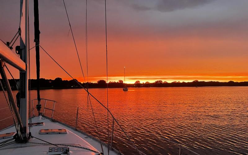 Debbie and I sailed across the Bay in 10-15 knots breeze from the south. We anchored in Whitehall Creek to watch the sunset.