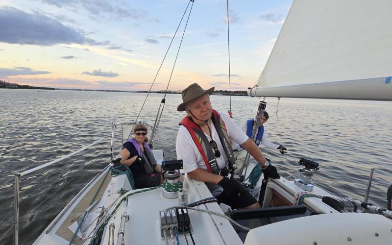 The fifth and final race of the series. Paul, Josh, Bob, Dave, Brian and me onboard. Dark Star and Moovin also participated. Pursuit Start with us going first, something of novelty! Dark Star caught us after the windward mark and we both labored downwind against the current. Dark Star finished about 10 minutes ahead of us and, Moovin was 26 minutes behind us. Raced a 5.78 NM course with illumination provided by a waxing gibbous moon.