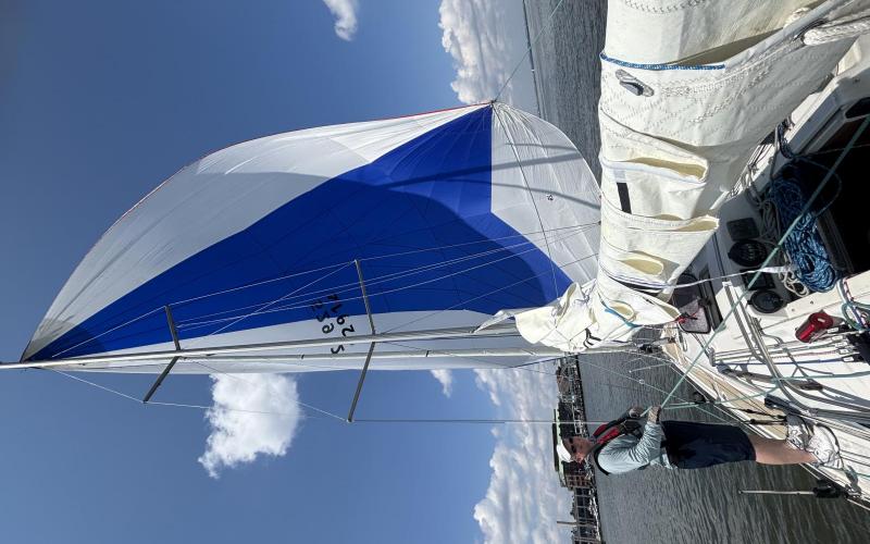 Dave, Josh, Paul, and I went out on a hot Saturday afternoon to practice spin hoists/douses. Breeze was extremely light, a little over 3 knots. Had to keep the diesel running in order to get to patches of breeze. Overall it was a frustrating series of hoists and drops.