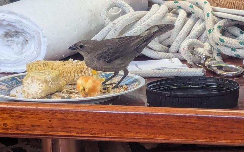 20 miles off the Georgia coast an exhausted female cow bird landed on Oriole (in 2023 we rescued a female oriole off the coast of NJ). We named her Daisy (a proper cow name) and fed and watered her. After many aborted attempts she finally left without returning offshore NAS PAX.