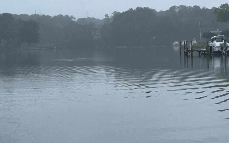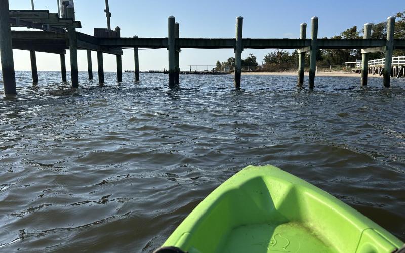 On a flat Bay, and under gray skies, I paddled to the Breezy Point dock and back.