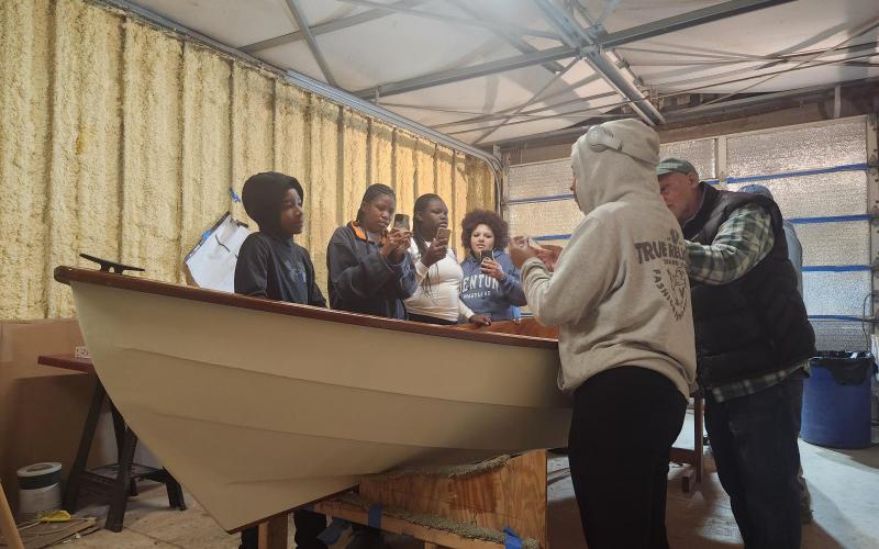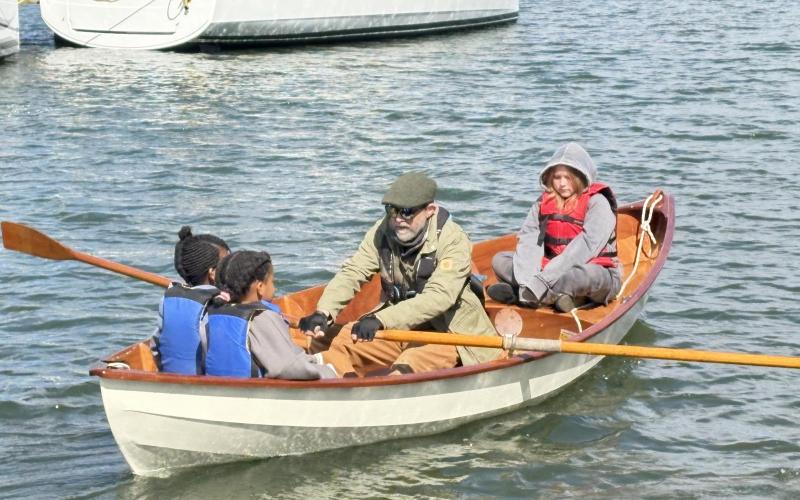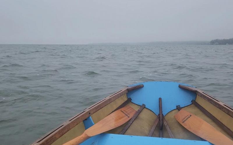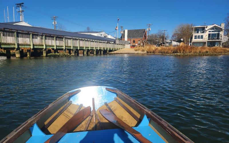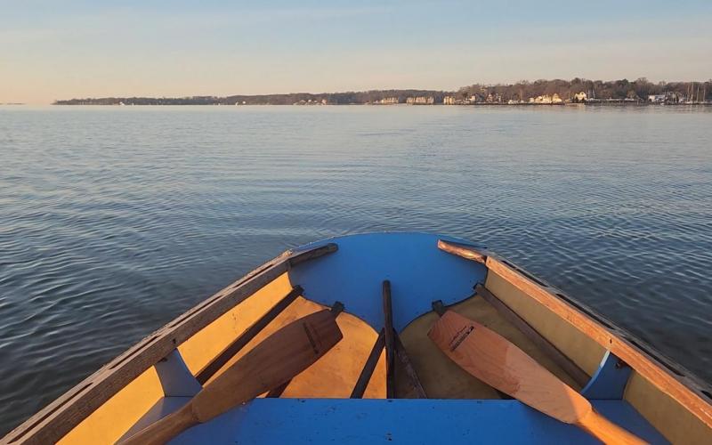 Today I rowed with a stiff wind down the creek for the launch of the Chesapeake Light Craft skerry the kids have been building all winter.