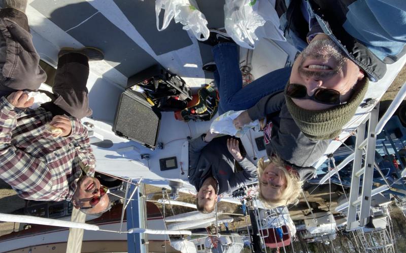 Boat maintenance preparing Patriot to splash. Dried hull and added ring dings.