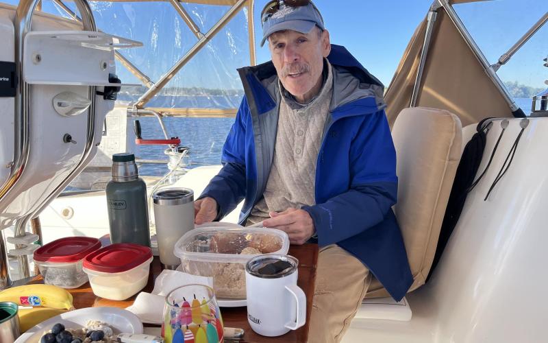 Took Escape out for a breakfast sail. 57F, sunny, with wind at 10 mph from the NE at time of departure (8:00 am). Saw wind pick up to 16. Ultimately anchored in cove by North Ferry Point for breakfast. Back to dock at 11:10am.