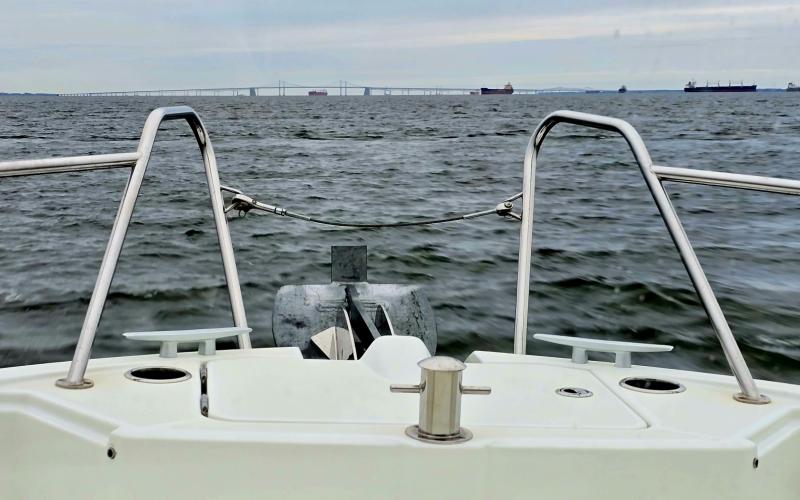 Looking up at the Chesapeake Bay, through the windshield... Nice to be warm inside the boat....