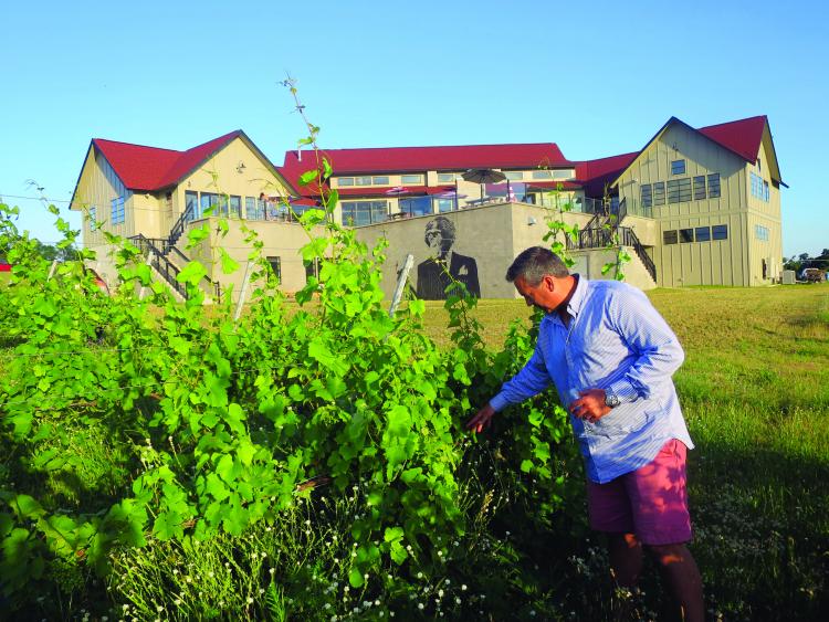 Owner Todd Oosterhouse checks his grapes at Bonobo Winery on Old Mission Peninsula, easy to visit while charter sailing on Lake MIchigan. Photo by Eric Vohr