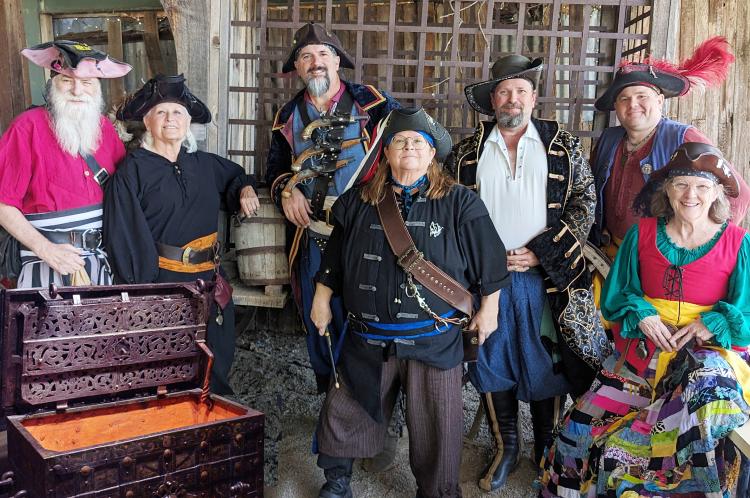 We currently have seven band members: Craig Lutke (Maroon the Shantyman), Christopher Dallion (Sharbait Simon the Scapegoat), Ted Dossey (John Crow the Cook), Nathan Campbell (Splice the Rigger), Mary Dossey (Fanny the Flagmaker), Marj Troyer (Ruby Pearl the Quartermaster), and Trae Hamilton (Black Pearl the Cannoneer). However, we have had 23 band members over the band’s lifespan. We think we could still take them in a West Side Story sing-off showdown, though.