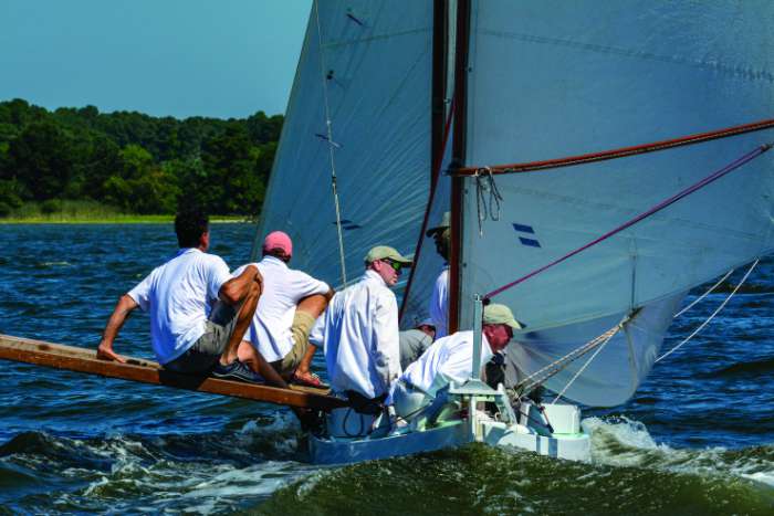 Heavy air arrived for the Myers Heritage Regatta at Tred Avon Yacht Club on Saturday, August 23. After a tough morning race, canoes returned to a building breeze in the afternoon. Three canoes capsized or suffered race-ending rig damage. Amid all the carnage, Island Blossom took the gun, ensuring a first-place finish where every other canoe owed them time on handicap. Rooted in tradition, the canoes use a rudimentary handicap system based only on hull length and breadth and fixed since the 19th century at six seconds per foot per mile.