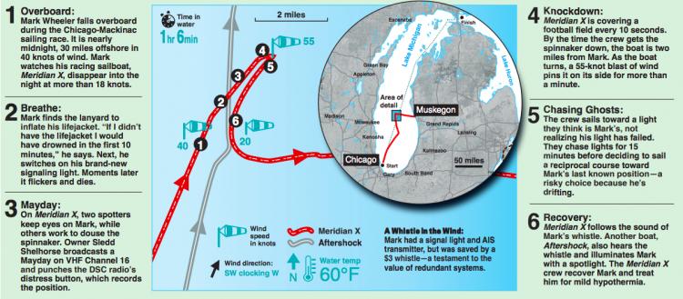 Mark Wheeler went overboard a few minutes before midnight. He was in the middle of Lake Michigan, 30 miles offshore in 40 knots of wind. As he fumbled for the lanyard to inflate his lifejacket he watched his racing sailboat, Meridian X, disappear into the night at more than 18 knots.