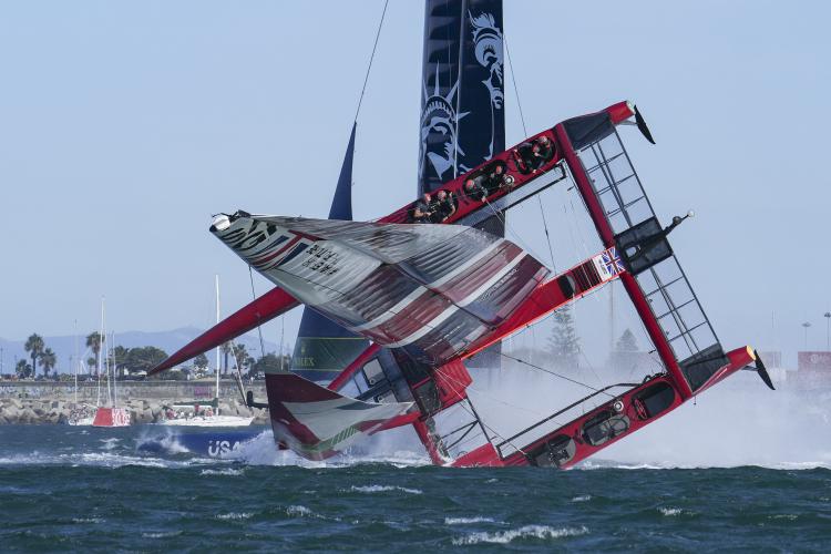 The British boat failed to slacken its jib sheet and catapulted to a dramatic capsize right in front of the American and Australian boats.