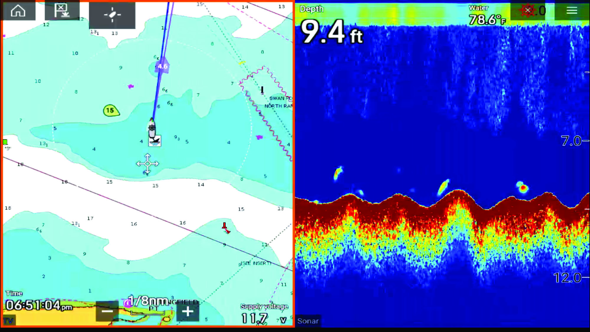I covered the entire Bar from an east to west line 200 yards north of the Swan Point Channel North Range Light [south] to G3 and did not touch bottom, wasn’t even scared. I started with a rising tide, calm weather, and a relatively slow speed anticipating something. After a couple of hours, I had a new chart of the Bar thanks to Sonar Chart Live.